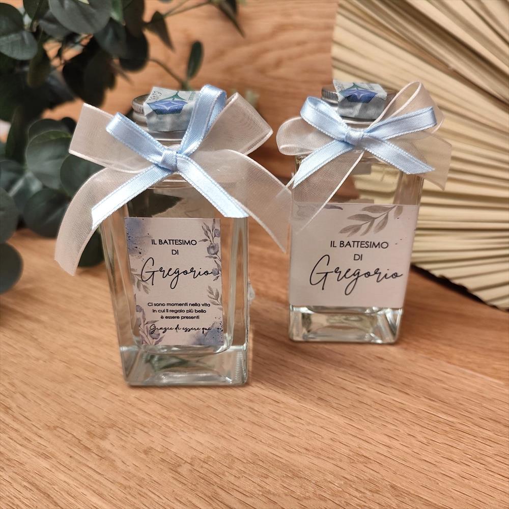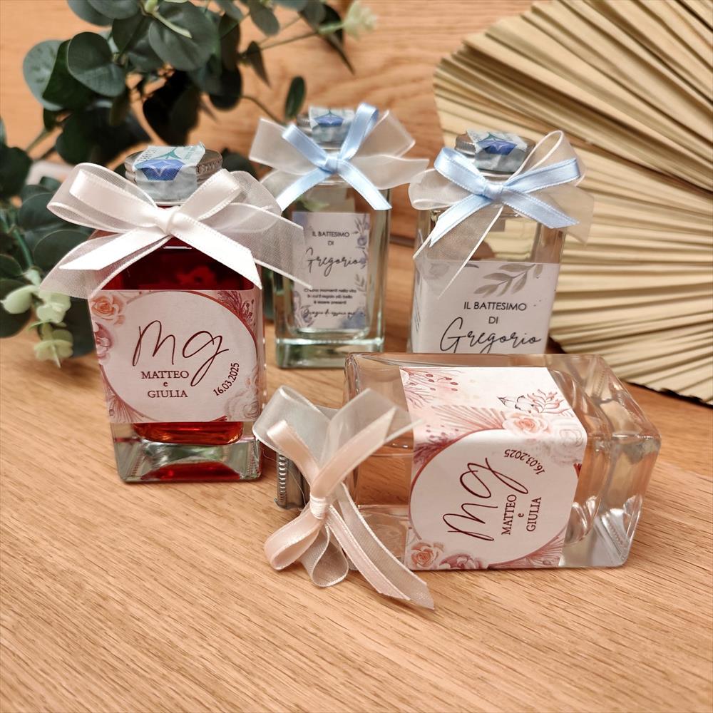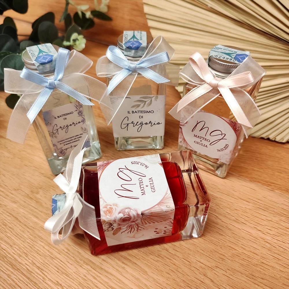 Incluso: confezionamento con fiocchi in toulle e raso con colore a scelta, etichetta personalizzata con font e colori.